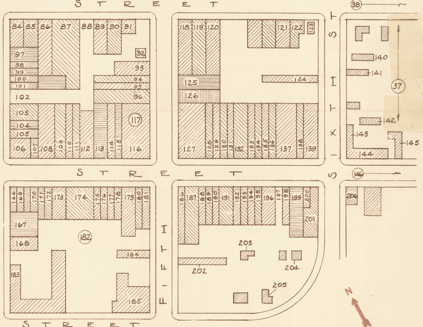 A large business district quickly sprung up where the miners and ranchers would spend their earnings, and it quickly became prosperous. In 1882, the town had multiple churches, and places of legal leisure along with numerous saloons, casinos, and brothels, with many of these buildings depicted here. The map designates a number to each property, which are then listed in the key on the back. Some famous buildings in this district which are listed in the key are: Jim Vogan’s Bowling alley, Schieffelin Hall, Bird Cage theatre, the O.K. Corral, and Fly’s Photography gallery.